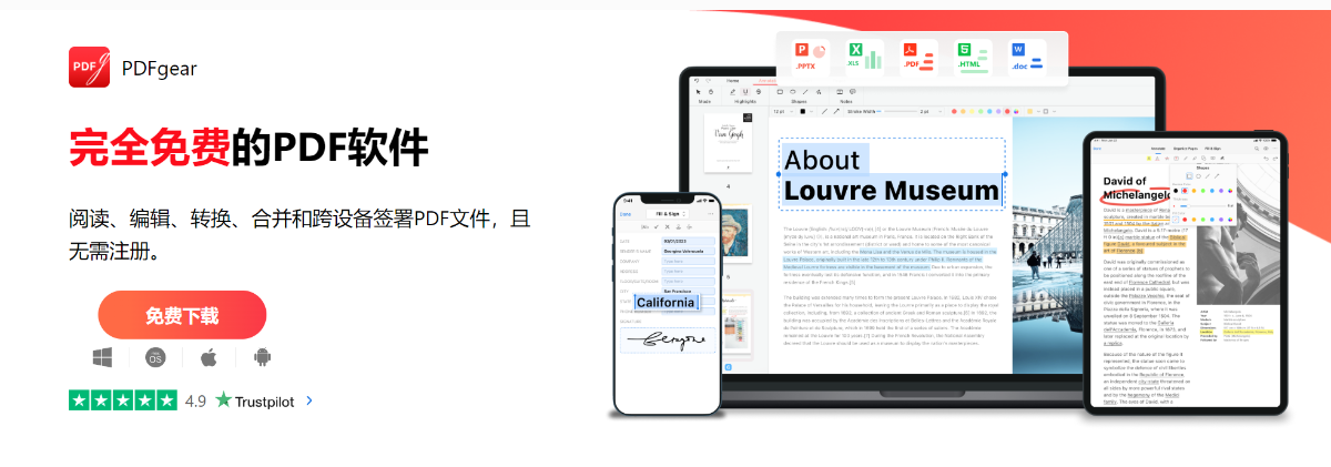 PDFgear 完全免费的PDF软件 阅读、编辑、转换、合并和跨设备签署PDF文件,且无需注册。